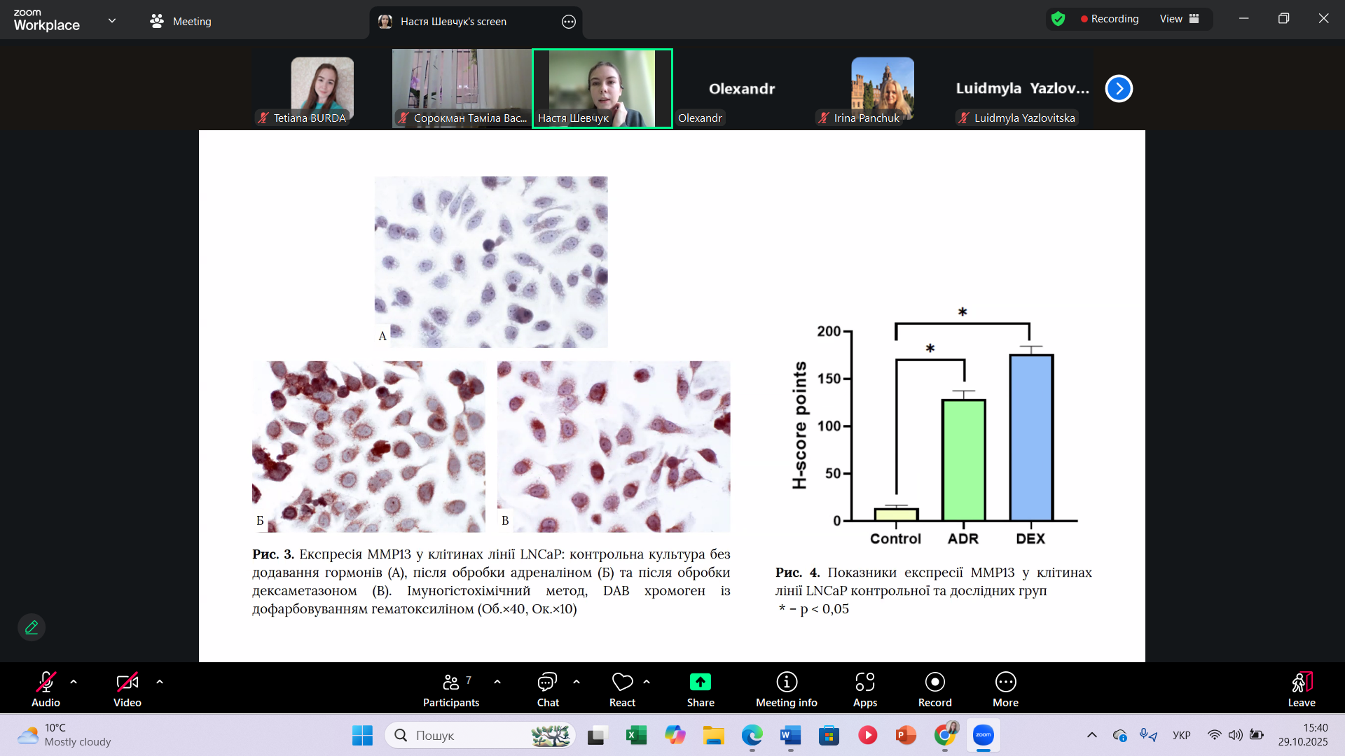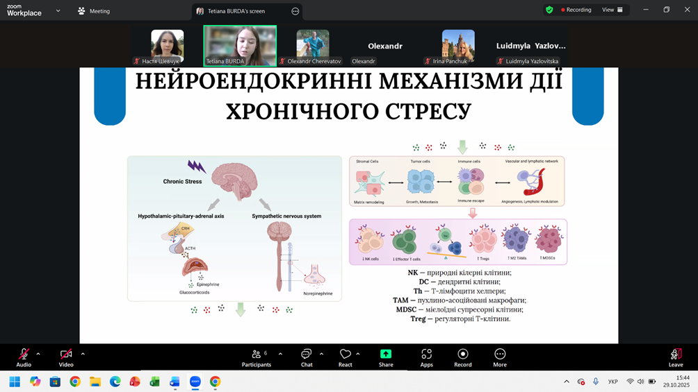 From 27 to 30 October 2025, the XX International Scientific Conference “Chargaff Readings” was held in Chernivtsi at Yuriy Fedkovych Chernivtsi National University in a hybrid format. The conference was dedicated to the 150th anniversary of Chernivtsi National University and the 120th anniversary of the birth of Erwin Chargaff. Within the scientific program, young researchers of IEPOR presented studies on the effects of stress factors on tumor cell biology. Oral presentations were delivered by Anastasiia Shevchuk (Stress hormone–induced regulation of TGF-β–linked osteogenic and ECM-remodeling genes in LNCaP prostate cancer cells) and Tetiana Burda (Modeling chronic stress conditions in an in vitro system).