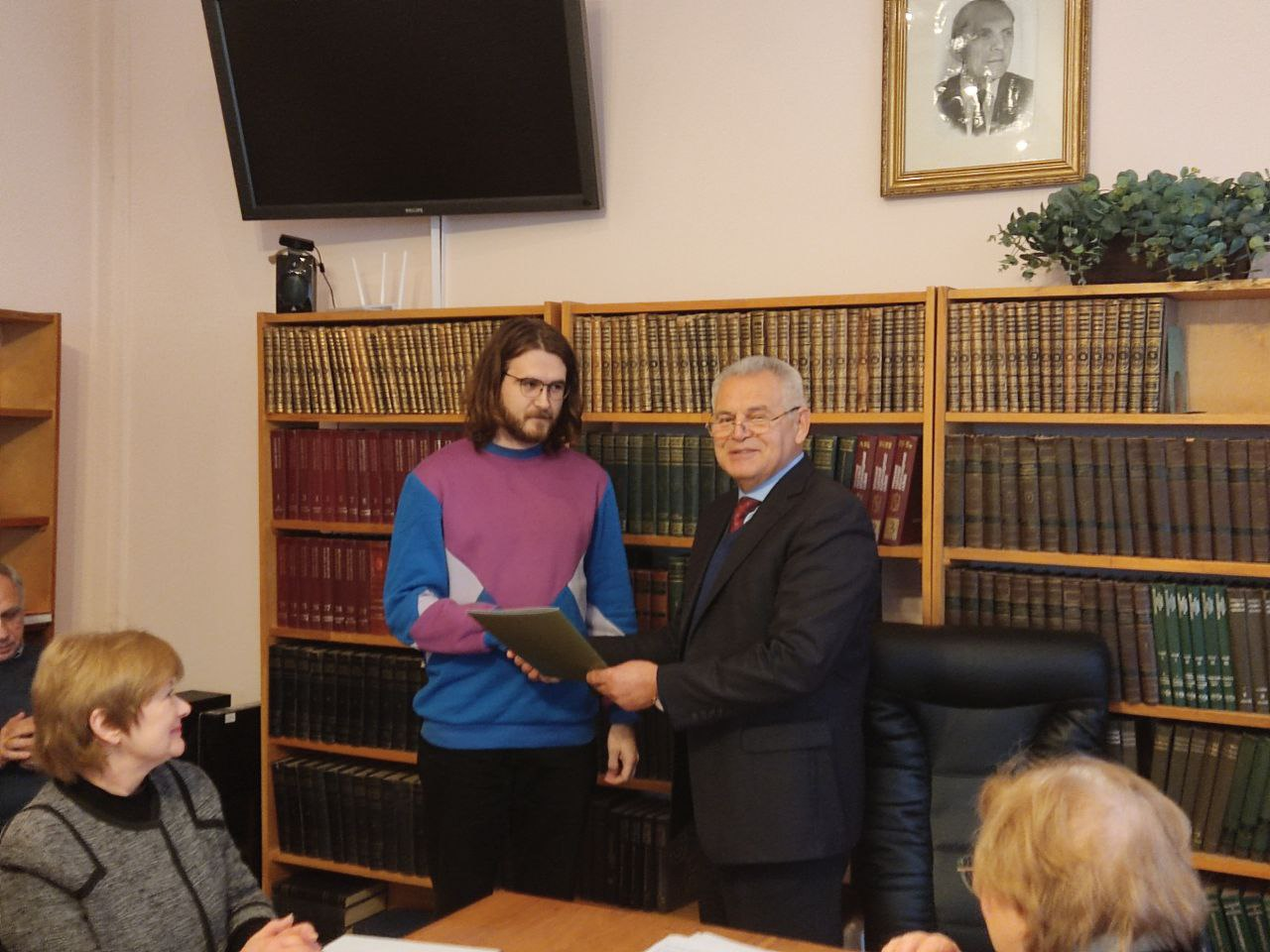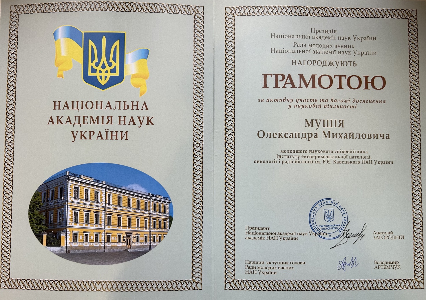 The Council of Young Scientists of the R. E. Kavetsky Institute of Experimental Pathology, Oncology and Radiobiology of the NAS of Ukraine sincerely congratulates Oleksandr Mushii, a postgraduate student of the Department of Tumor Process Monitoring and Therapy Design, on receiving a high distinction — a Certificate of Commendation from the Presidium of the NAS of Ukraine and the Council of Young Scientists of the NAS of Ukraine.